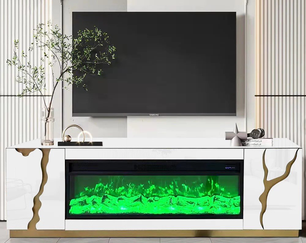 This combination of crisp, contemporary white with glossy glass doors and a silver-toned metallic base looks chic. This stand is suitable for various interior styles, from modern minimalist to urban industrial. In addition, the integrated fireplace features captivating 3D-powered flame visuals, providing a warm, glowing ambiance that doubles as a central focal point.