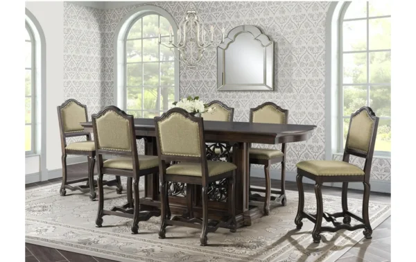 The Chesley Counter Height Collection offers a blend of functionality and aesthetic appeal, making it an excellent addition to any home. The table’s design includes a drop-in 20-inch leaf, allowing it to extend to 96 inches. This feature ensures that the table can comfortably accommodate multiple guests. The base of the table is adorned with intricate, decorative woodwork, making it the centerpiece of your dining room.
