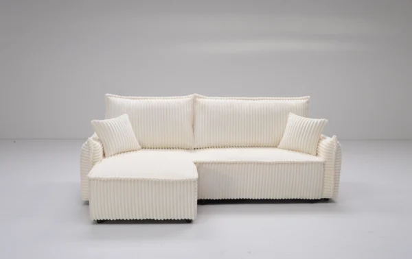 This sectional features a soft, ribbed corduroy-like texture that enhances its cozy appeal while providing exceptional comfort. The plush upholstery, paired with high-density foam cushions, offers an inviting seating experience for everyday use or entertaining guests. Its clean lines and contemporary silhouette make it a stylish focal point for any room.