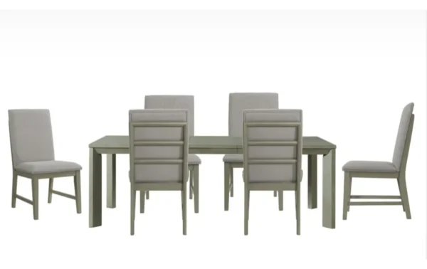 The Zig Dining Room Set is a masterpiece of modern elegance and functionality. To begin with, it transforms any dining space into a sophisticated haven. This set includes a sleek rectangular table and six beautifully crafted chairs. Moreover, all pieces are in a light gray hue that exudes contemporary charm. As for the chairs, their cushioned seats and backs blend comfort with style. They invite guests to linger longer at the table. Additionally, the extendable table can expand with an 18-inch leaf, accommodating additional guests. Thus, it is perfect for both intimate dinners and larger gatherings.